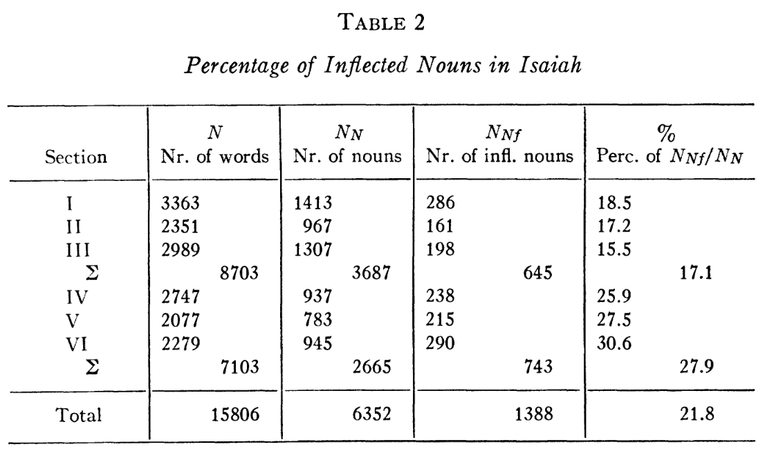 Radday's research discovered multiple statistically significant findings demonstrating a strong difference in the style being used between the first section of Isaiah (In the graph "Sections I, II, and III") vs the second and third sections (IV, V, and VI). So for instance you can see in the last column the percentage of inflected nouns between the sections is very neatly divided into 2 sections.